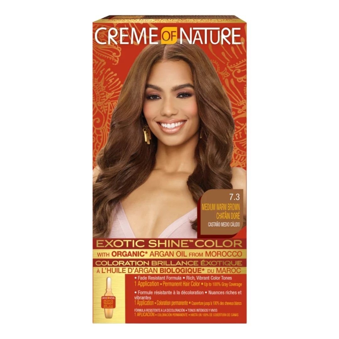Creme of Nature Exotic Shine™ Hair Color in de tint Medium Warm Brown (7.3) biedt een rijke, warme bruine kleur met natuurlijke glans en diepte. Deze permanente haarkleuring is verrijkt met Marokkaanse arganolie, die het haar tijdens het kleurproces voedt, beschermt en versterkt, voor een stralend resultaat zonder uitdroging.